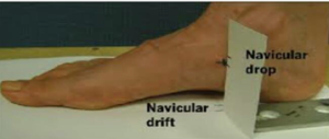 در طی انجام این آزمون ابتدا آزمودنی بر روی یک صندلی می نشیند به صورتی که پا در حالت بی وزن باشد.سپس پای فرد را در حالت طبیعی وچرخش خنثی قرار میدهیم.و با لمس ناحیه داخلی پا و همزمان با حرکت چرخش داخلی و خارجی محل برجستگی سر استخوان ناوی را مشخص میکنیم.فاصله آن تا زمین را روی کاغذ علامت میزنیم.سپس از آزمودنی میخواهیم که بایستد به گونه ای که وزن روی پا قرار گیرد در این حالت نیز فاصله زمین تا سر استخوان ناوی را روی کاغذ علامت میزنیم.اختلاف دوعلامت روی کاغذ را اندازه می گیریم اگر بالای 10 میلی مترباشد فرد دارای ناهنجاری کف پا صاف می باشد.